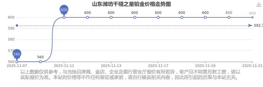 于 2025年11月22日,山东潍坊千禧之星铂金价格的克价为600.0元/克。