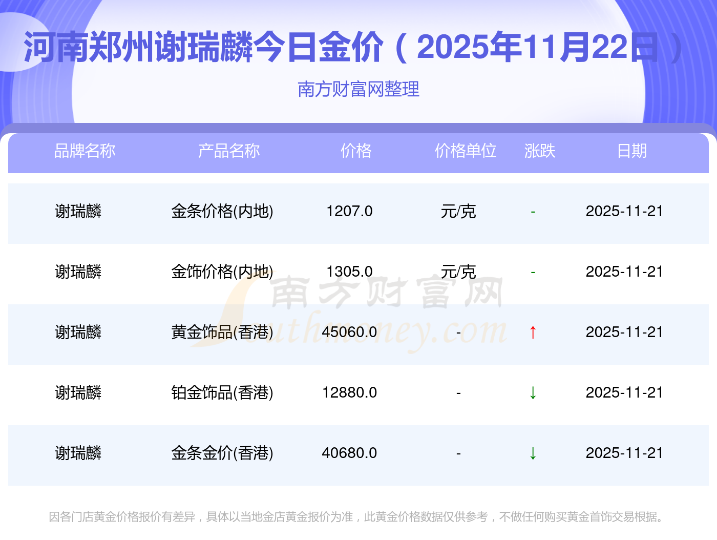 2025年11月22日河南郑州谢瑞麟金价查询:黄金价格1305.0元/克,铂金价格616.0元/克,饰品金价(内地)1305.0元/克,黄金饰品(香港)45110.0,铂金价格(香港)17570.0,金条价格(香港)40690.0,金条金价(内地)1143.0元/克,黄金价格1298.0元/克,铂金价格600.0元/克,足金价格1298.0元/克,黄金价格1266.0元/克。