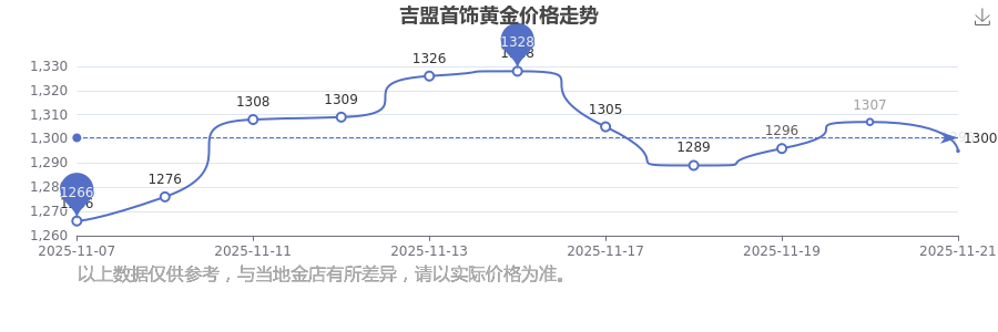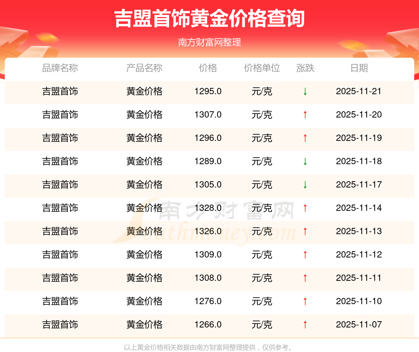 想查询今天黄金价格,此刻黄金一克的价格是多少呀?通常情况下1克黄金的价钱是多少左右?吉盟首饰 黄金价格在今日的最新价格显示为1295.0元/克。