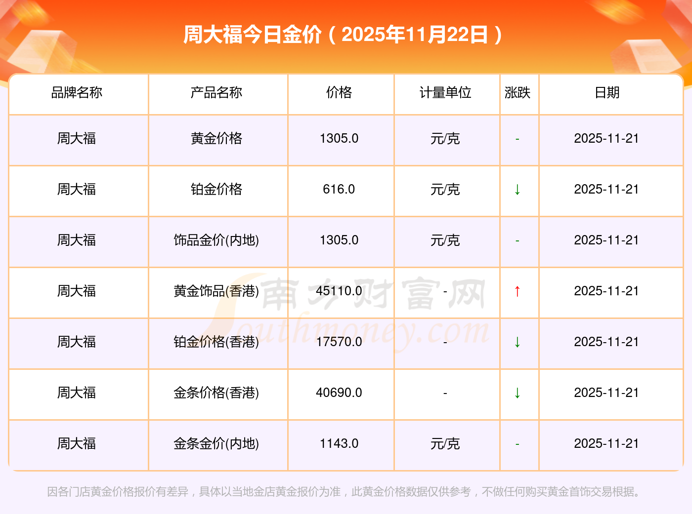 黄金价格1305.0元/克,铂金价格616.0元/克,饰品金价(内地)1305.0元/克,黄金饰品(香港)45110.0,铂金价格(香港)17570.0,金条价格(香港)40690.0,金条金价(内地)1143.0元/克,黄金价格1298.0元/克,铂金价格600.0元/克,足金价格1298.0元/克,黄金价格1266.0元/克。