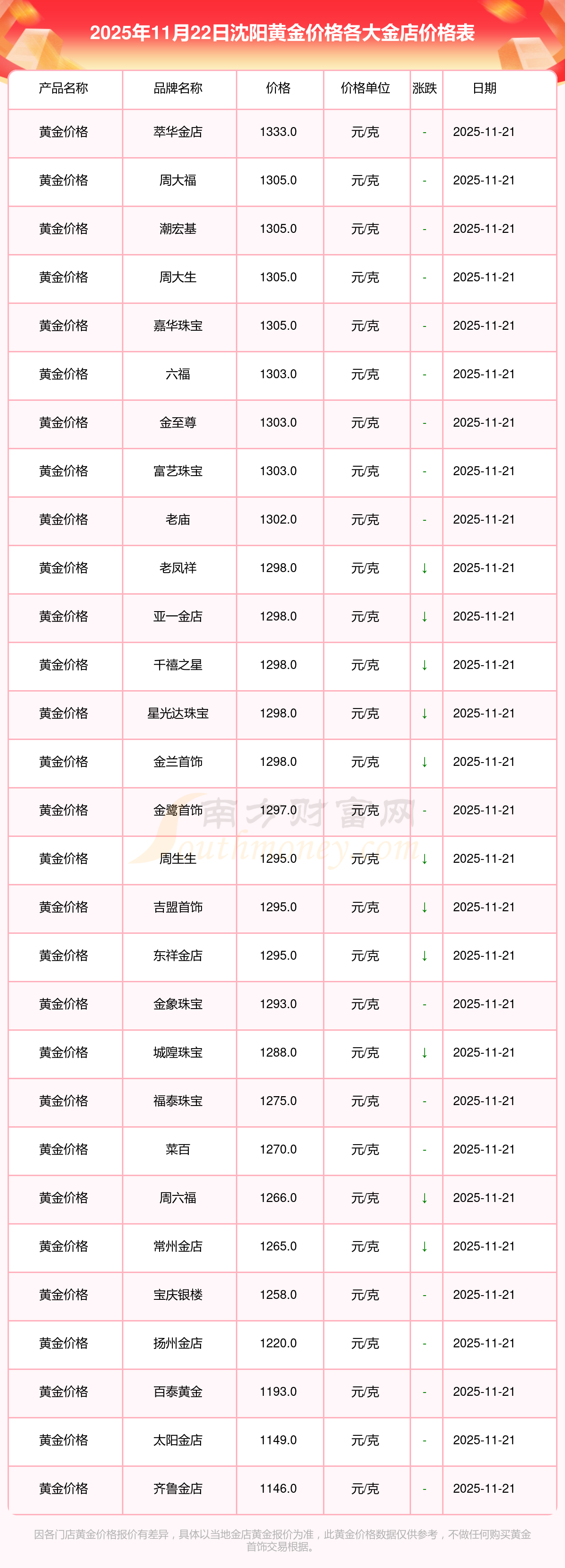 2025年11月22日沈阳各大金店黄金价格最新价格查询来了:周大福1305.0元/克,周大福616.0元/克,周大福1305.0元/克,周大福45110.0,周大福17570.0,周大福40690.0,周大福1143.0元/克,老凤祥1298.0元/克,老凤祥600.0元/克,老凤祥1298.0元/克,周六福1266.0元/克。