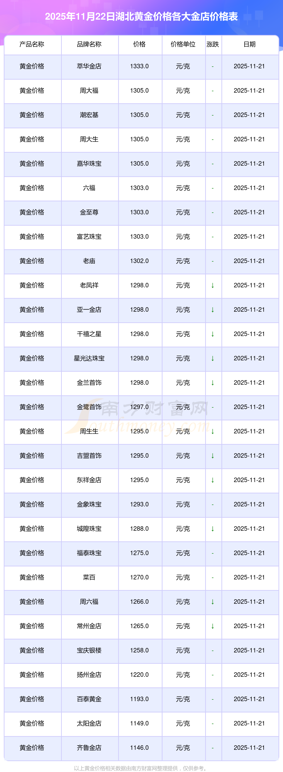 今天是2025年11月22日,湖北周大福、周大福、周大福、周大福、周大福、周大福、周大福、老凤祥、老凤祥、老凤祥、周六福等各大金店品牌黄金价格最新价格行情是这样的:周大福1305.0元/克、周大福616.0元/克、周大福1305.0元/克、周大福45110.0、周大福17570.0、周大福40690.0、周大福1143.0元/克、老凤祥1298.0元/克、老凤祥600.0元/克、老凤祥1298.0元/克、周六福1266.0元/克。