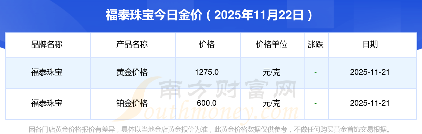 2025年11月22日福泰珠宝金条多少钱1克 现在南京福泰珠宝黄金价格查询