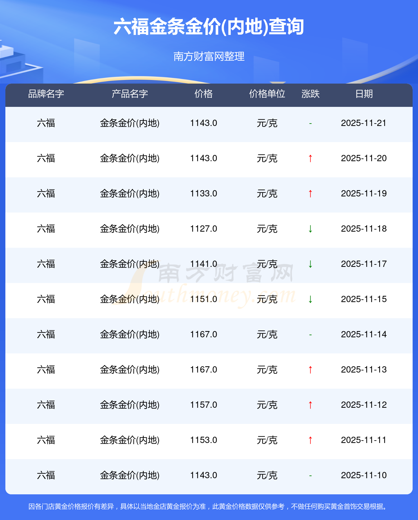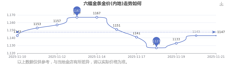 六福 金条金价(内地)今日最新的价位是1143.0元/克。