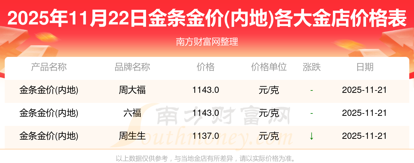 今天是2025年11月22日,周大福、周大福、周大福、周大福、周大福、周大福、周大福、老凤祥、老凤祥、老凤祥、周六福等各大金店品牌金条金价(内地)最新价格如下:周大福1305.0元/克、周大福616.0元/克、周大福1305.0元/克、周大福45110.0、周大福17570.0、周大福40690.0、周大福1143.0元/克、老凤祥1298.0元/克、老凤祥600.0元/克、老凤祥1298.0元/克、周六福1266.0元/克。