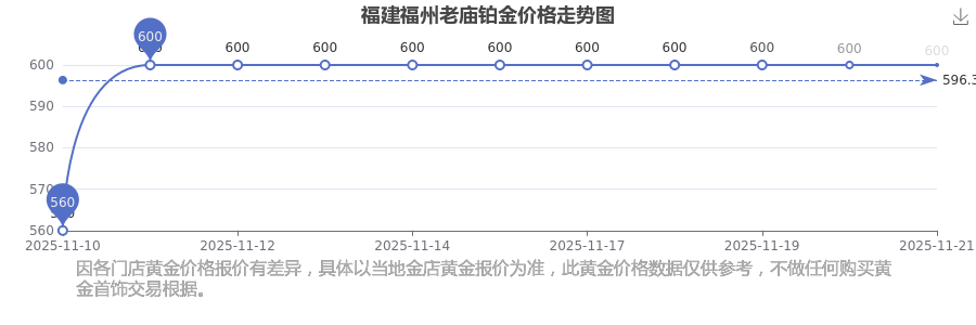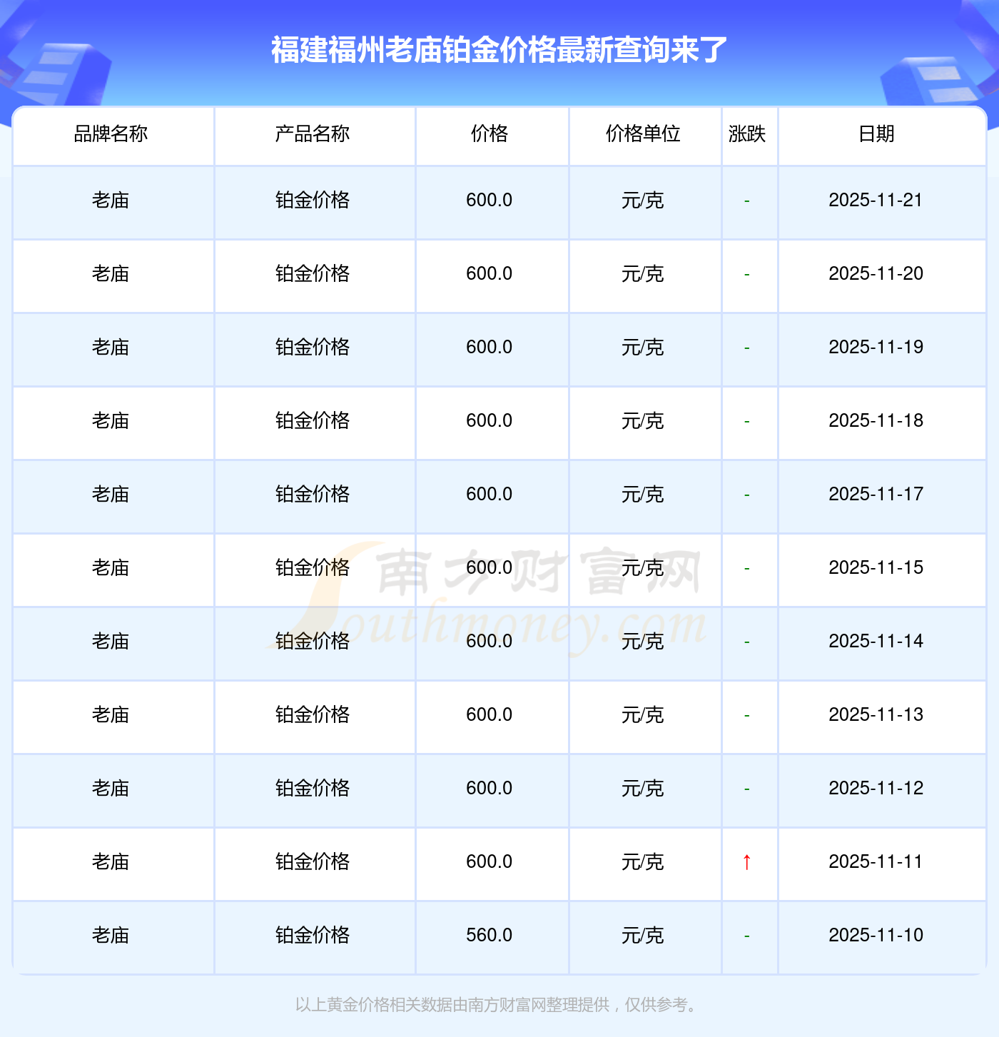 今日(2025年11月22日),福建福州老庙铂金价格每克的价值为600.0元/克。