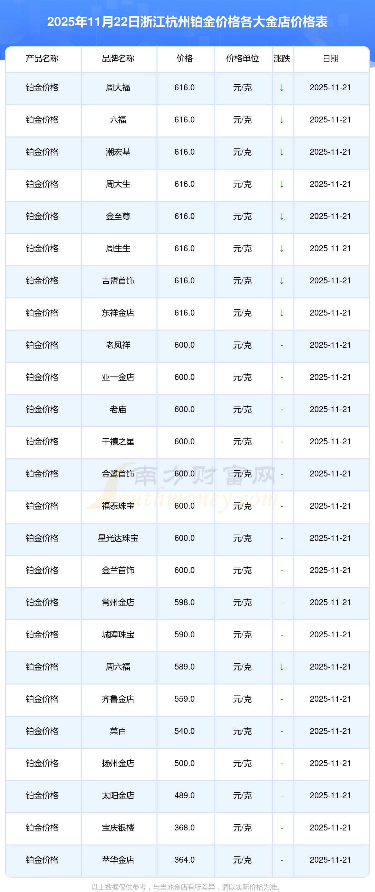 2025年11月22日浙江杭州周大福、周大福、周大福、周大福、周大福、周大福、周大福、老凤祥、老凤祥、老凤祥、周六福等各大金店品牌铂金价格最新价格如下:周大福黄金价格1305.0元/克,周大福铂金价格616.0元/克,周大福饰品金价(内地)1305.0元/克,周大福黄金饰品(香港)45110.0,周大福铂金价格(香港)17570.0,周大福金条价格(香港)40690.0,周大福金条金价(内地)1143.0元/克,老凤祥黄金价格1298.0元/克,老凤祥铂金价格600.0元/克,老凤祥足金价格1298.0元/克,周六福黄金价格1266.0元/克。