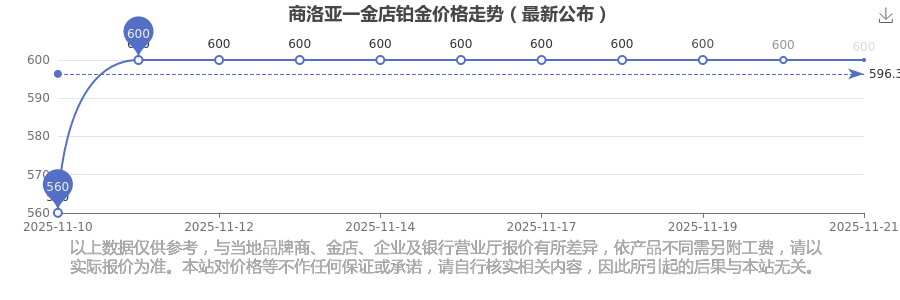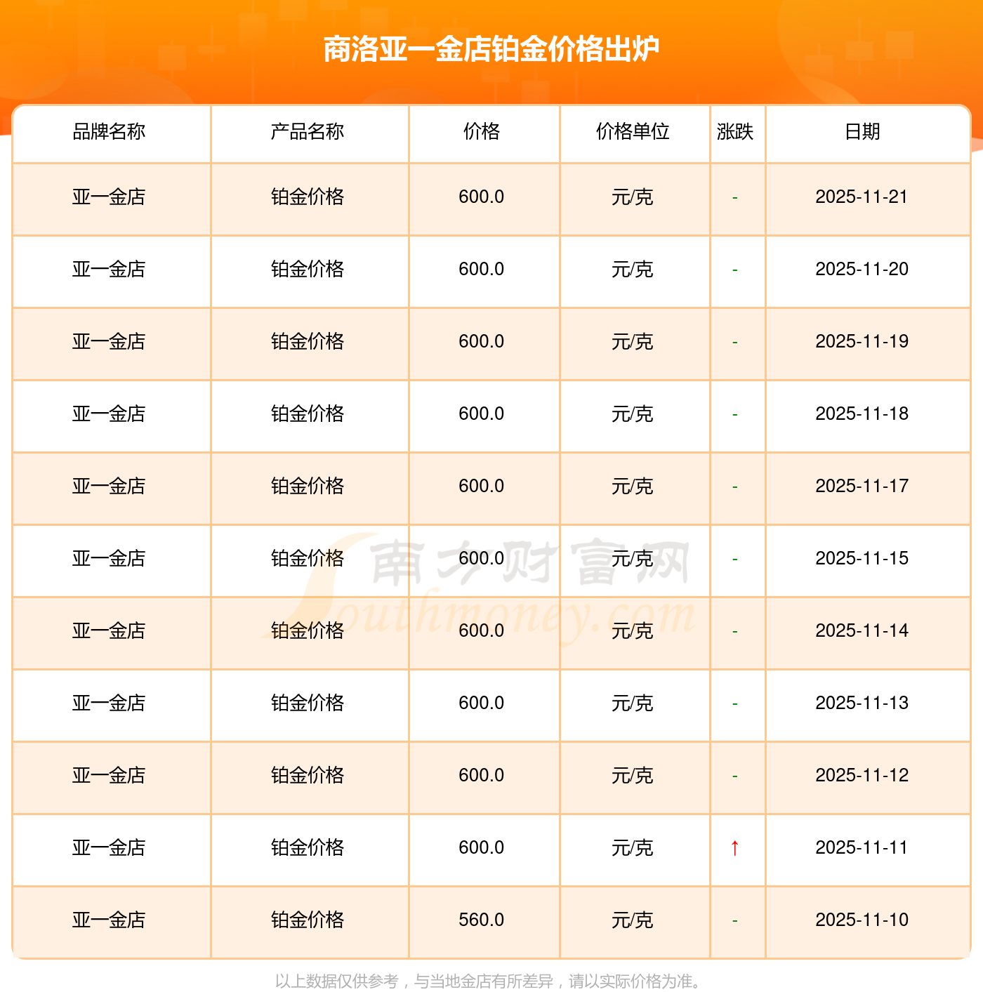 今日商洛亚一金店铂金价格最新为:600.0元/克。