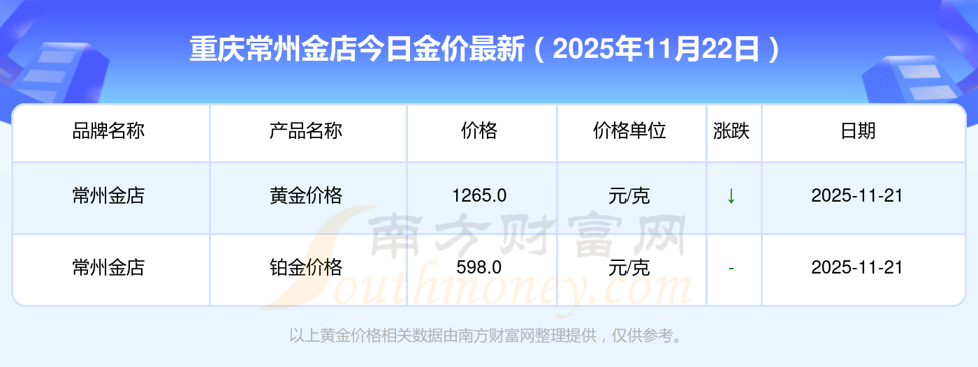 今天黄金价位是多少?现在一克黄金的价格是多少呀? 2025年11月22日重庆常州金店一克黄金对应的价格是多少?黄金价格1305.0元/克,铂金价格616.0元/克,饰品金价(内地)1305.0元/克,黄金饰品(香港)45110.0,铂金价格(香港)17570.0,金条价格(香港)40690.0,金条金价(内地)1143.0元/克,黄金价格1298.0元/克,铂金价格600.0元/克,足金价格1298.0元/克,黄金价格1266.0元/克。