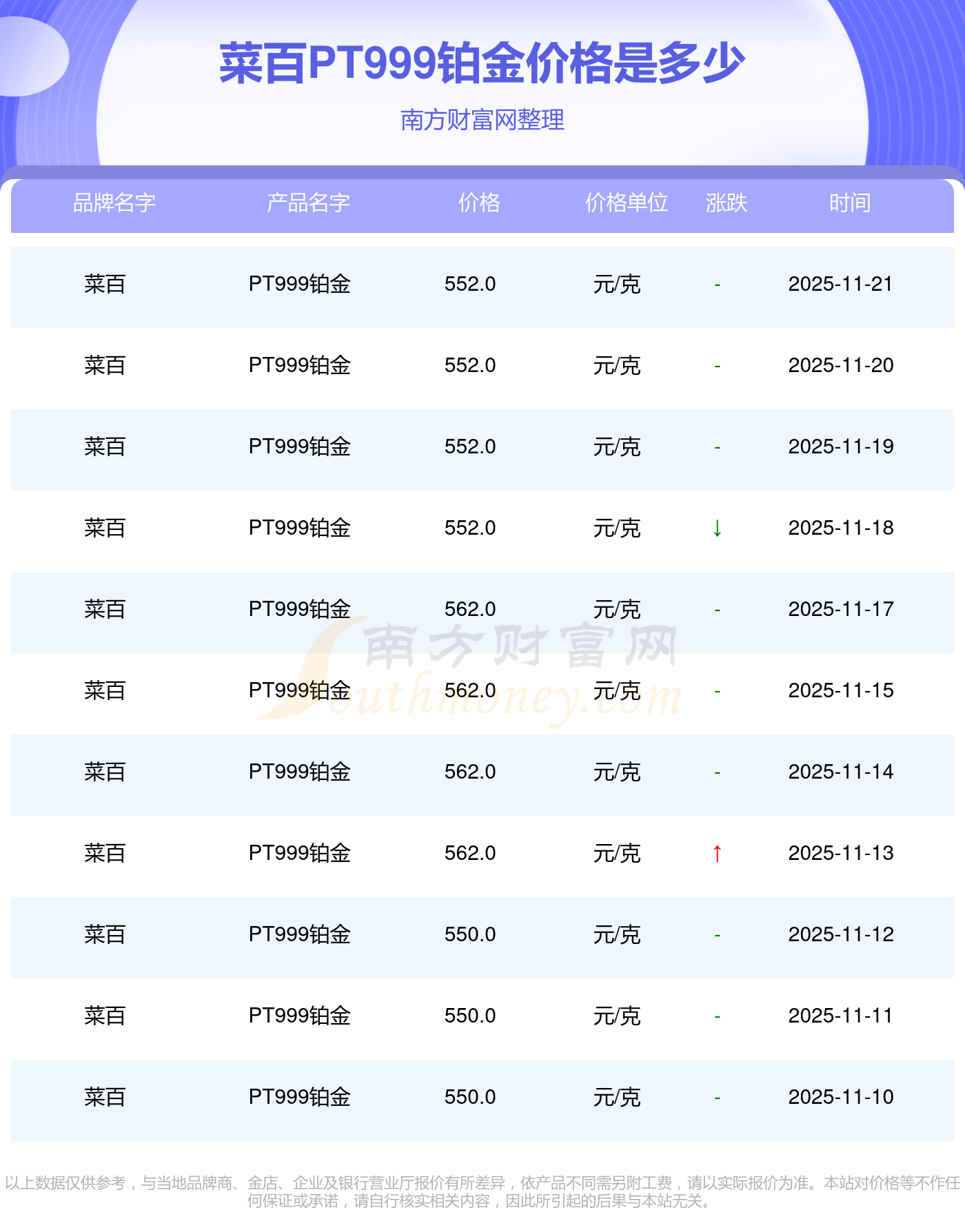今日(2025年11月22日)菜百PT999铂金价格是552.0元/克。
