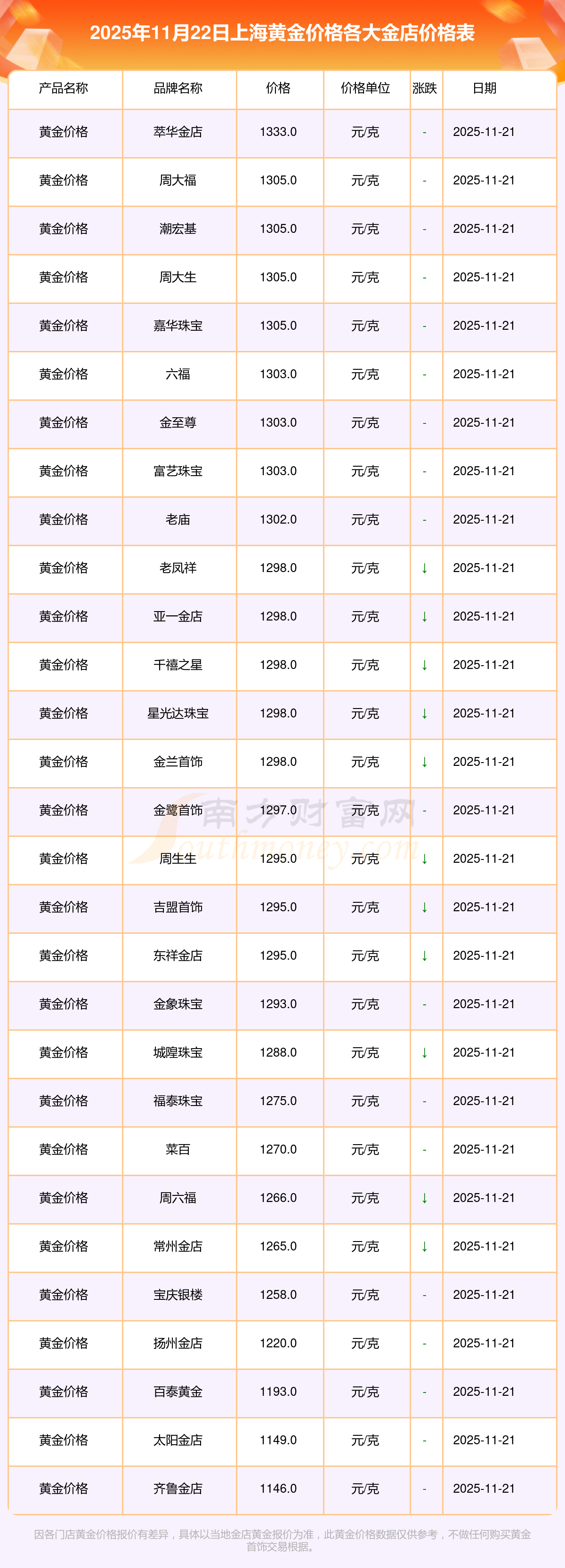 2025年11月22日,上海周大福、周大福、周大福、周大福、周大福、周大福、周大福、老凤祥、老凤祥、老凤祥、周六福等各大金店品牌黄金价格今日价格如下:周大福1305.0元/克、周大福616.0元/克、周大福1305.0元/克、周大福45110.0、周大福17570.0、周大福40690.0、周大福1143.0元/克、老凤祥1298.0元/克、老凤祥600.0元/克、老凤祥1298.0元/克、周六福1266.0元/克。
