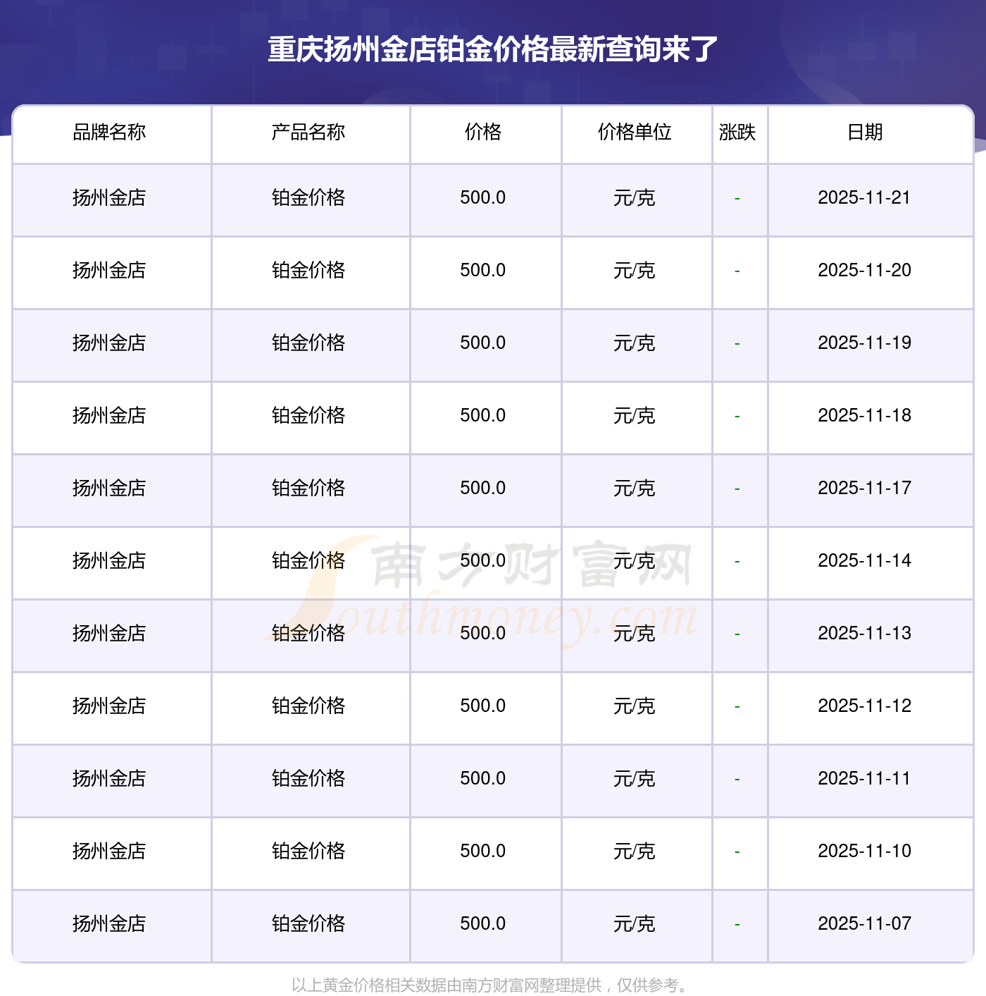 今日重庆扬州金店铂金价格最新查询,2025年11月22日扬州金店铂金价格是多少钱一克?随小编来了解一下详情。