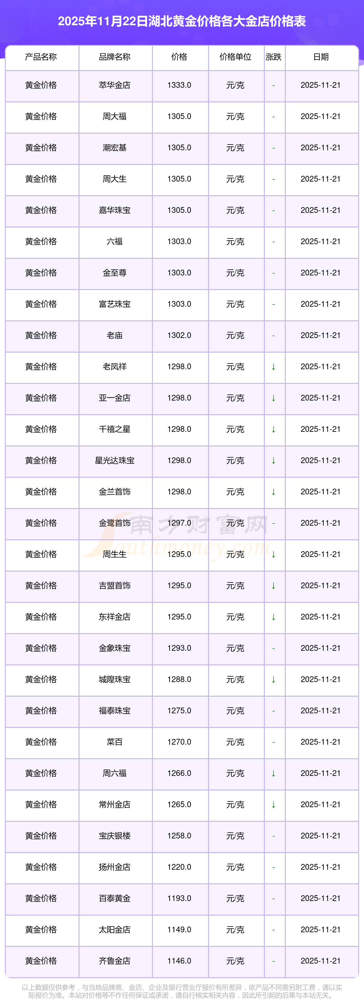 2025年11月22日,湖北周大福、周大福、周大福、周大福、周大福、周大福、周大福、老凤祥、老凤祥、老凤祥、周六福等各大金店品牌黄金价格今日价格行情最新来了:周大福1305.0元/克、周大福616.0元/克、周大福1305.0元/克、周大福45110.0、周大福17570.0、周大福40690.0、周大福1143.0元/克、老凤祥1298.0元/克、老凤祥600.0元/克、老凤祥1298.0元/克、周六福1266.0元/克。
