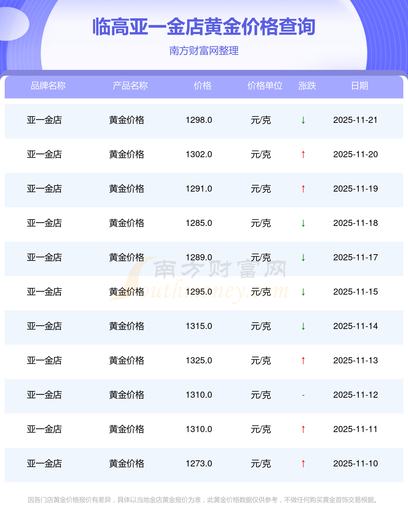 2025年11月22日,临高亚一金店的黄金价格标价达到 1298.0元/克。