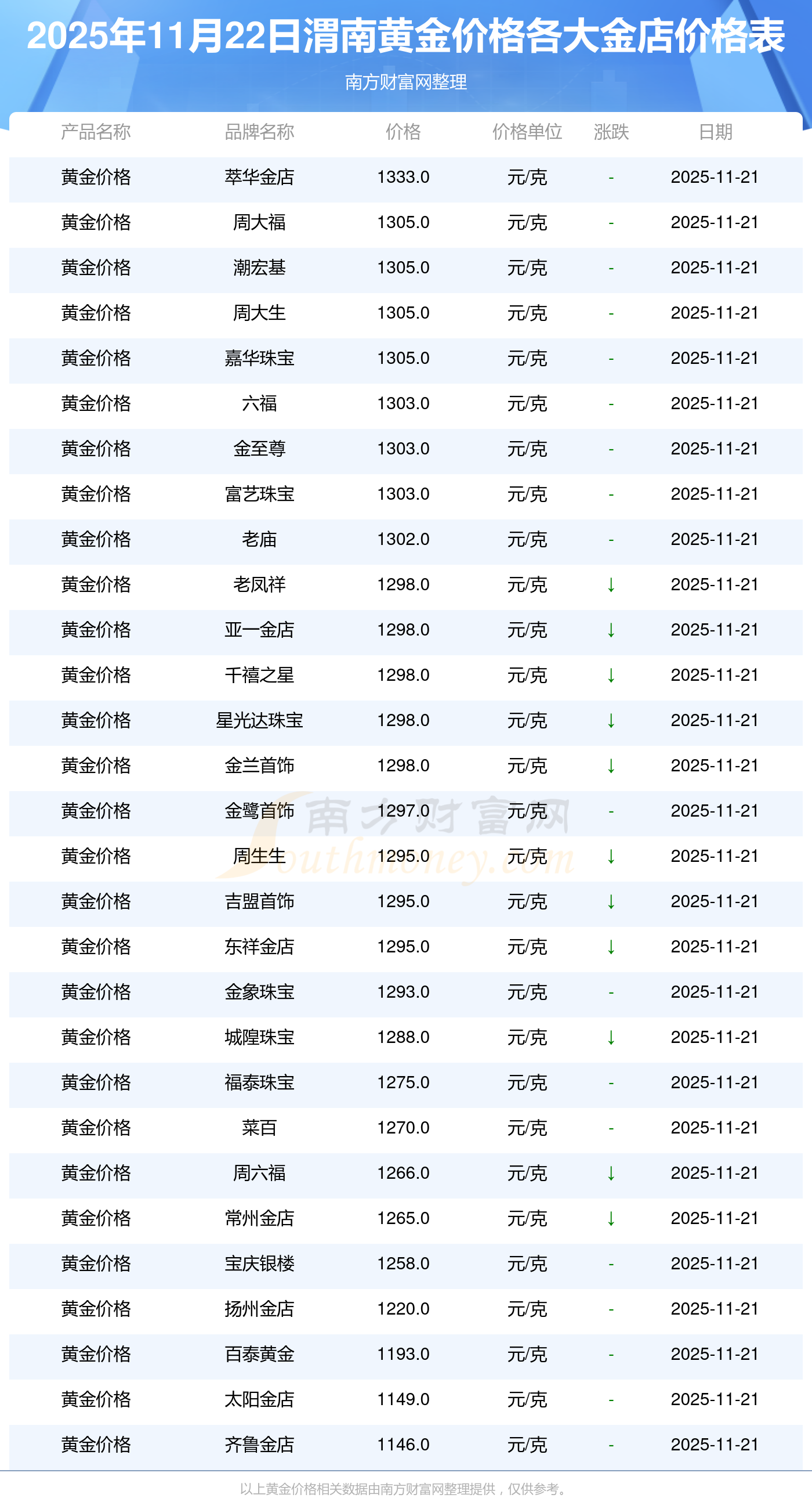 2025年11月22日渭南各大金店黄金价格最新价格:周大福1305.0元/克,周大福616.0元/克,周大福1305.0元/克,周大福45110.0,周大福17570.0,周大福40690.0,周大福1143.0元/克,老凤祥1298.0元/克,老凤祥600.0元/克,老凤祥1298.0元/克,周六福1266.0元/克。