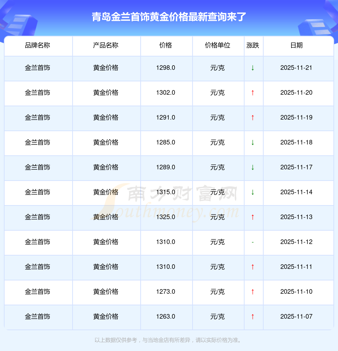 1298.0元/克,此乃青岛金兰首饰于 2025年11月22日黄金价格的挂牌价格。
