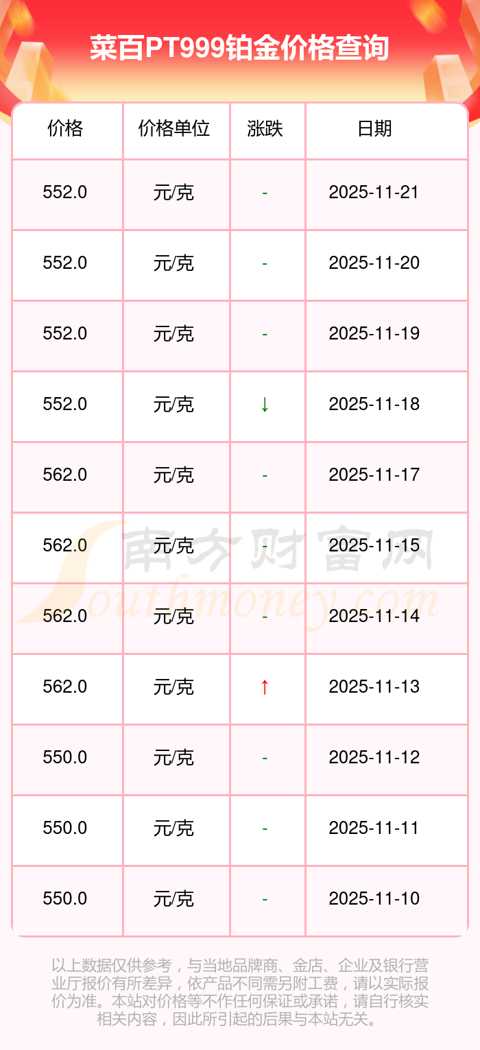 以上数据仅供参考,与当地品牌商、金店、企业及银行营业厅报价有所差异,依产品不同需另附工费,请以实际报价为准。本站对价格等不作任何保证或承诺,请自行核实相关内容,因此所引起的后果与本站无关。
