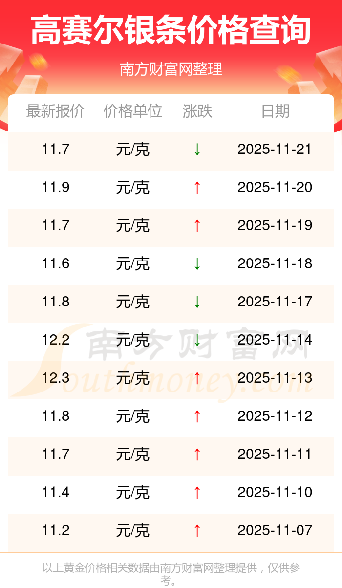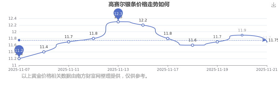 今日(2025年11月22日)高赛尔银条价格是11.7元/克。