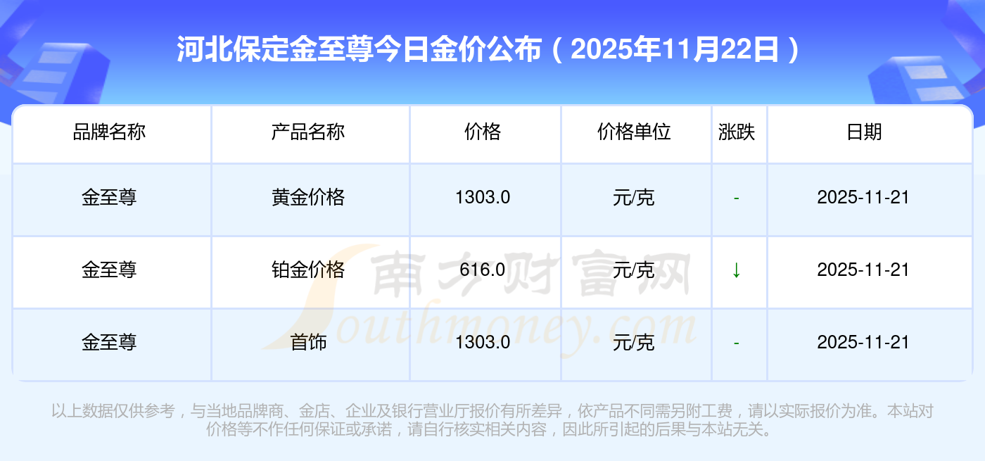 黄金价格1305.0元/克,铂金价格616.0元/克,饰品金价(内地)1305.0元/克,黄金饰品(香港)45110.0,铂金价格(香港)17570.0,金条价格(香港)40690.0,金条金价(内地)1143.0元/克,黄金价格1298.0元/克,铂金价格600.0元/克,足金价格1298.0元/克,黄金价格1266.0元/克。