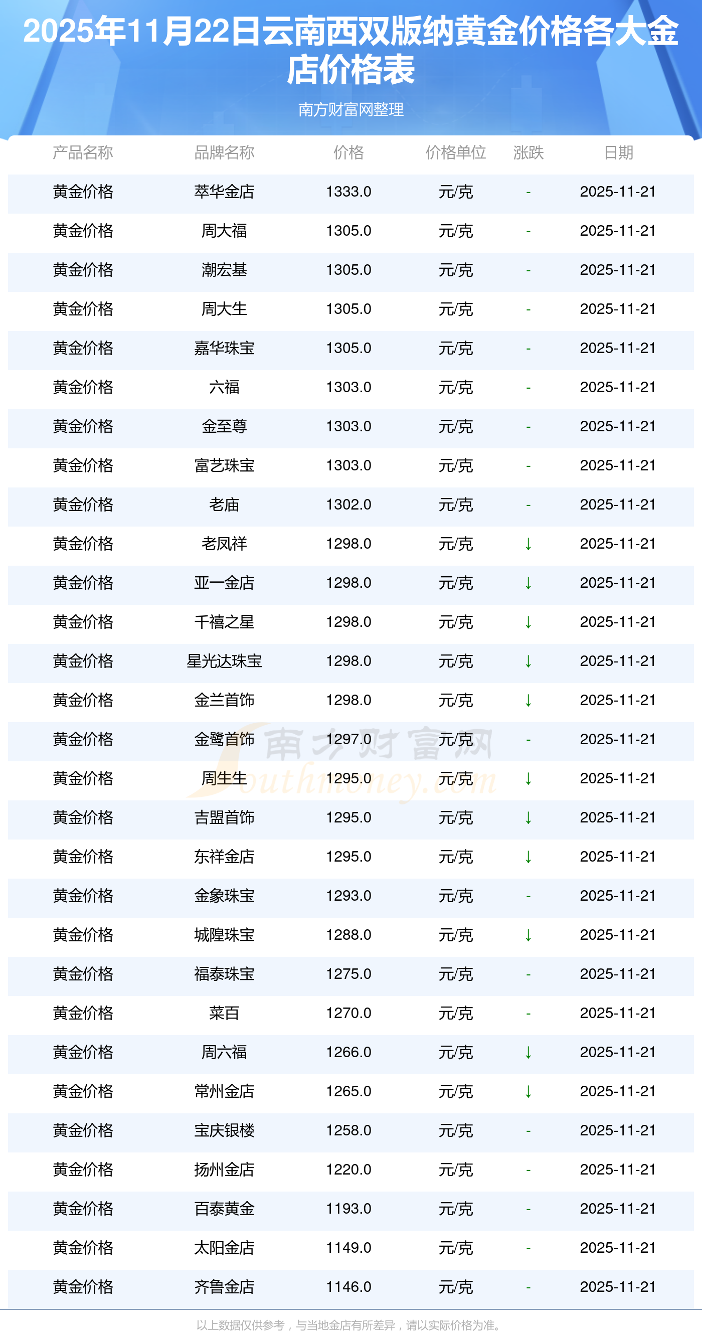 2025年11月22日,云南西双版纳周大福、周大福、周大福、周大福、周大福、周大福、周大福、老凤祥、老凤祥、老凤祥、周六福等各大金店品牌黄金价格今日价格如下:周大福1305.0元/克、周大福616.0元/克、周大福1305.0元/克、周大福45110.0、周大福17570.0、周大福40690.0、周大福1143.0元/克、老凤祥1298.0元/克、老凤祥600.0元/克、老凤祥1298.0元/克、周六福1266.0元/克。
