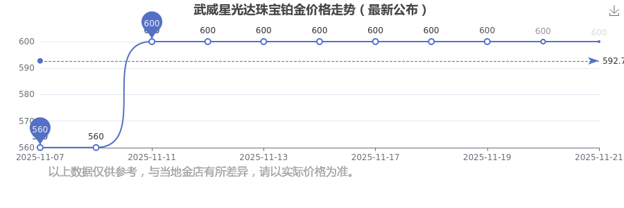 2025年11月22日武威星光达珠宝铂金价格:600.0元/克。