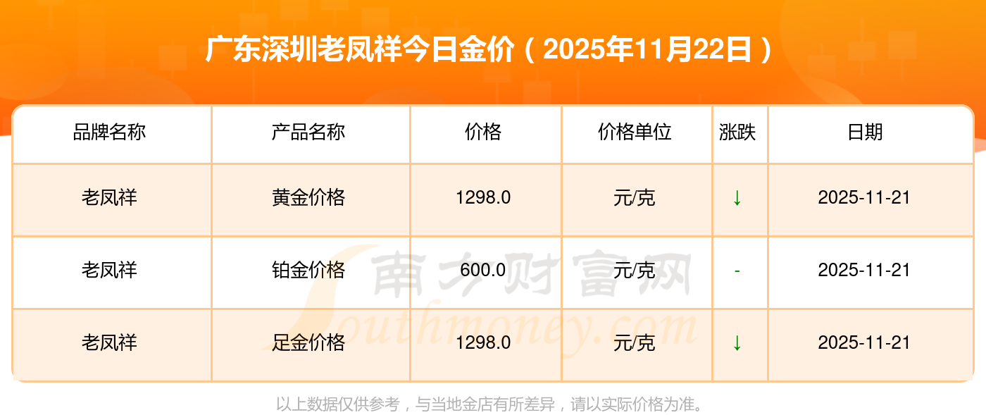 2025年11月22日广东深圳老凤祥现在购买一克黄金需要支付多少钱?黄金价格1305.0元/克,铂金价格616.0元/克,饰品金价(内地)1305.0元/克,黄金饰品(香港)45110.0,铂金价格(香港)17570.0,金条价格(香港)40690.0,金条金价(内地)1143.0元/克,黄金价格1298.0元/克,铂金价格600.0元/克,足金价格1298.0元/克,黄金价格1266.0元/克。