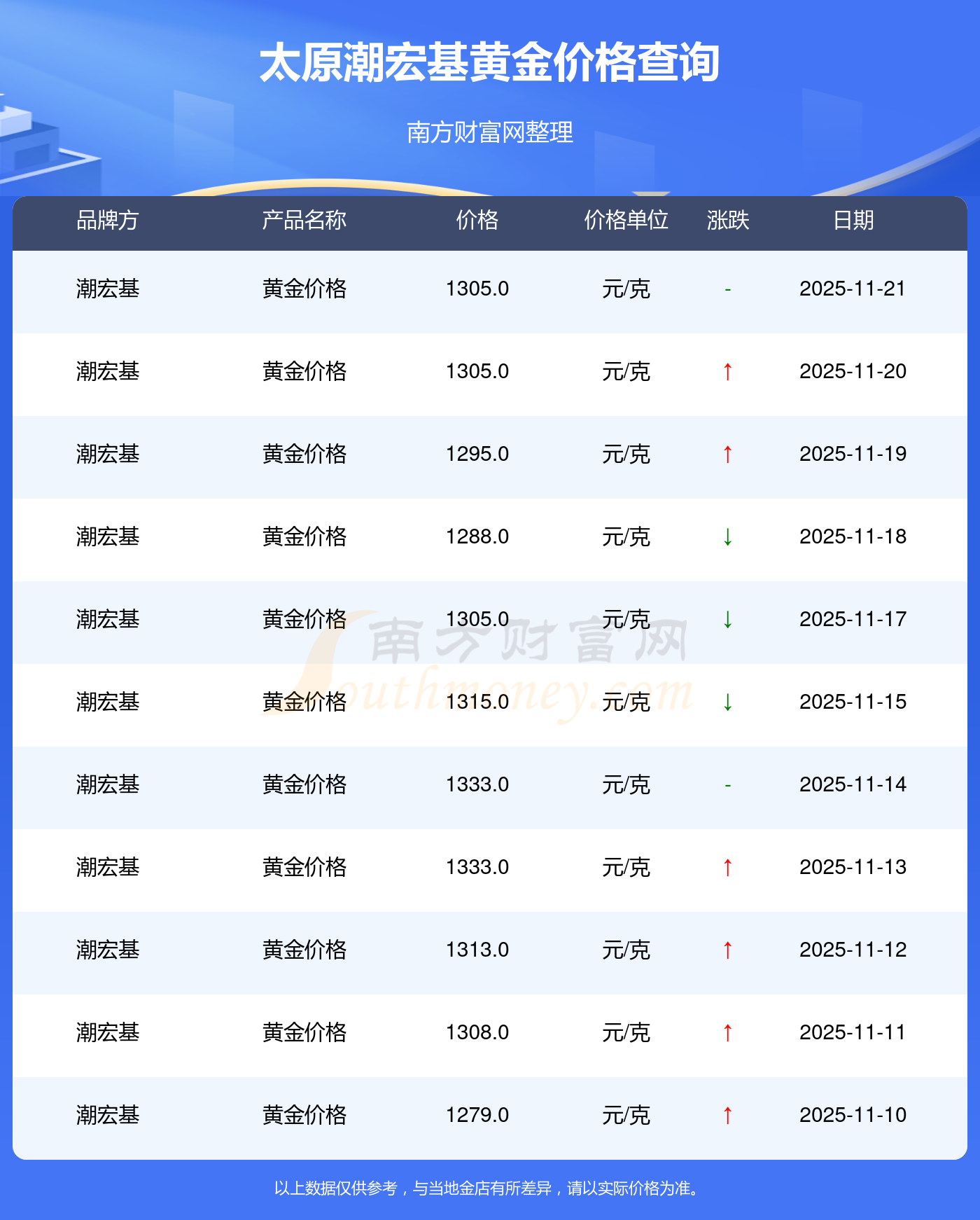 2025年11月22日当天,太原潮宏基黄金价格的单价是 1305.0元/克。