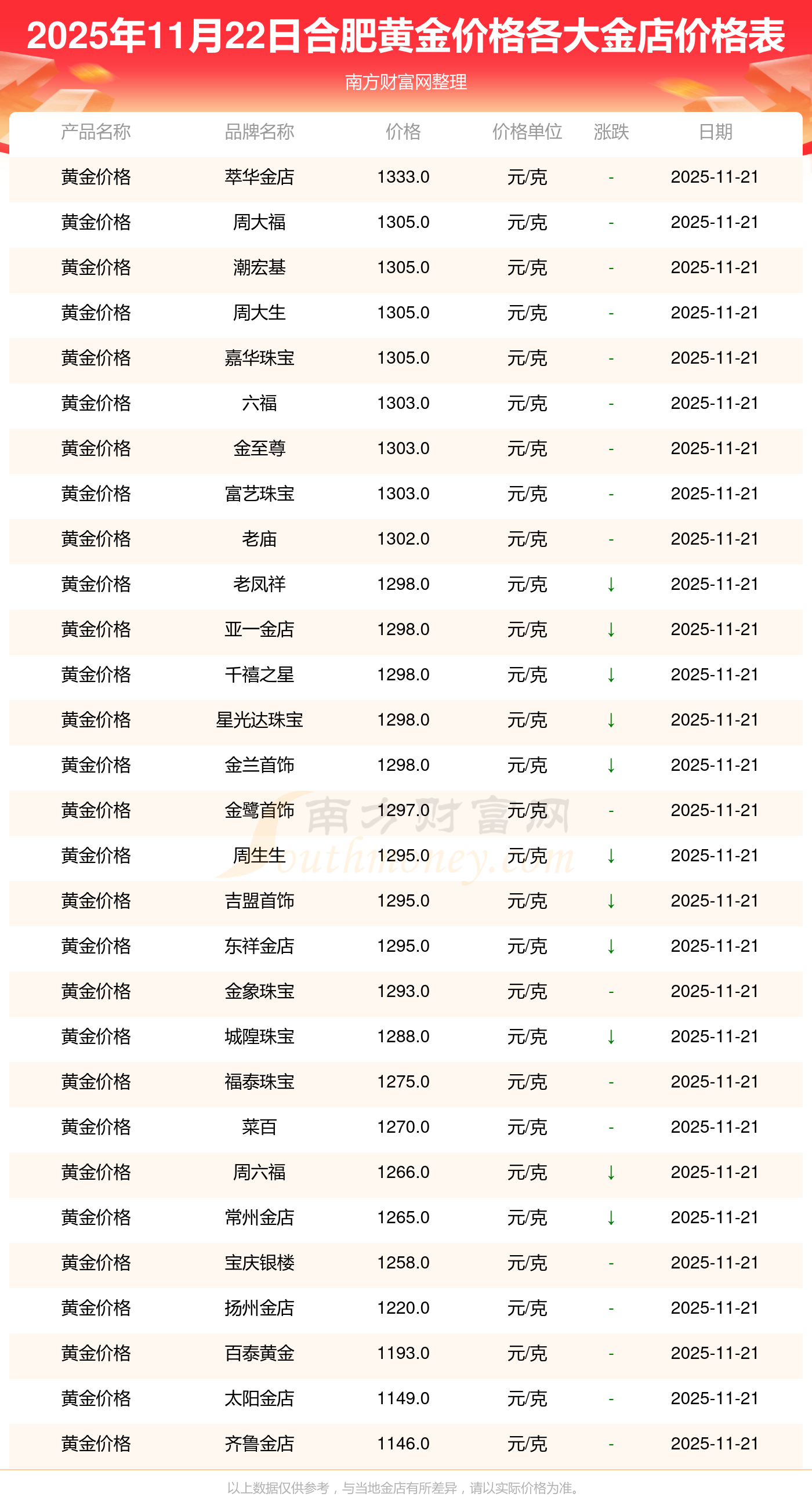 2025年11月22日,合肥周大福、周大福、周大福、周大福、周大福、周大福、周大福、老凤祥、老凤祥、老凤祥、周六福等各大金店品牌黄金价格今日价格如下:周大福1305.0元/克、周大福616.0元/克、周大福1305.0元/克、周大福45110.0、周大福17570.0、周大福40690.0、周大福1143.0元/克、老凤祥1298.0元/克、老凤祥600.0元/克、老凤祥1298.0元/克、周六福1266.0元/克。