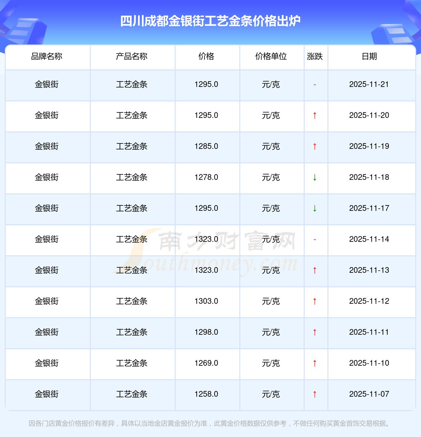 2025年11月22日四川成都金银街工艺金条价格是1295.0元/克。