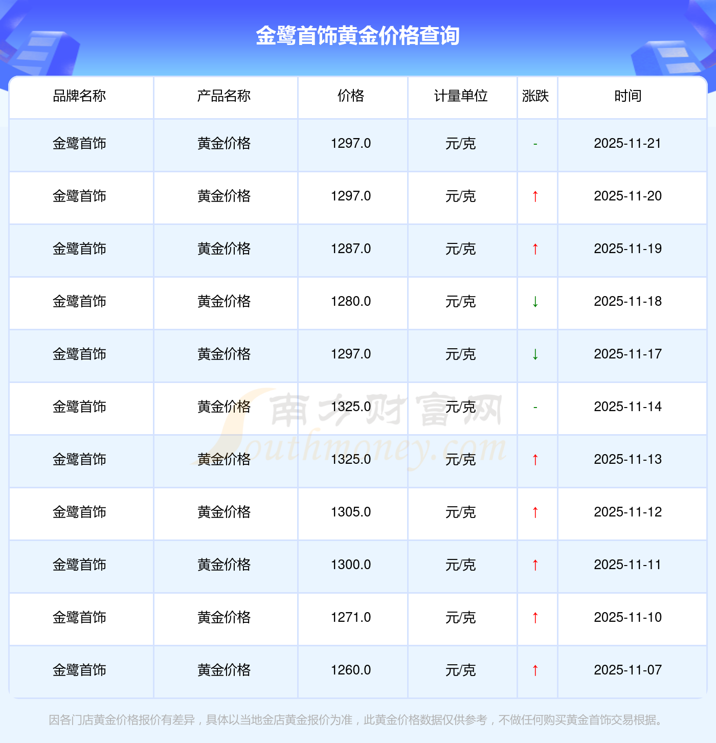 金鹭首饰 黄金价格在今日更新至1297.0元/克。
