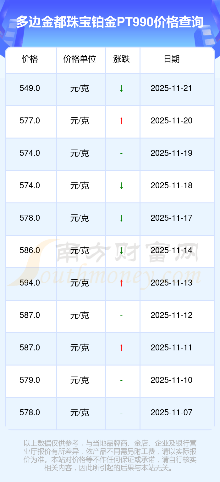 今日多边金都珠宝铂金PT990价格是549.0元/克。