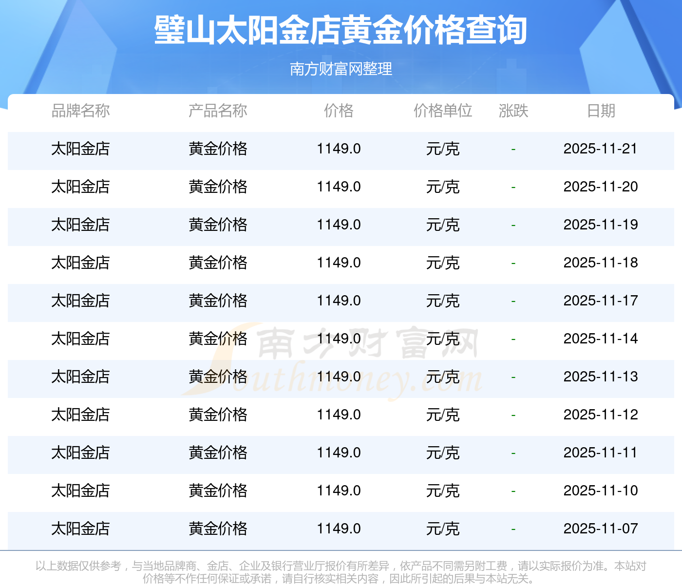 璧山太阳金店黄金价格在 2025年11月22日为 1149.0元/克。