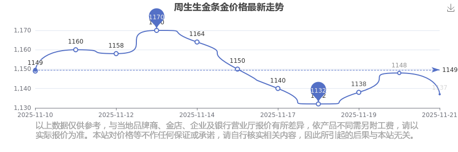 今日(2025年11月22日),周生生金条金价格:1137.0元/克。