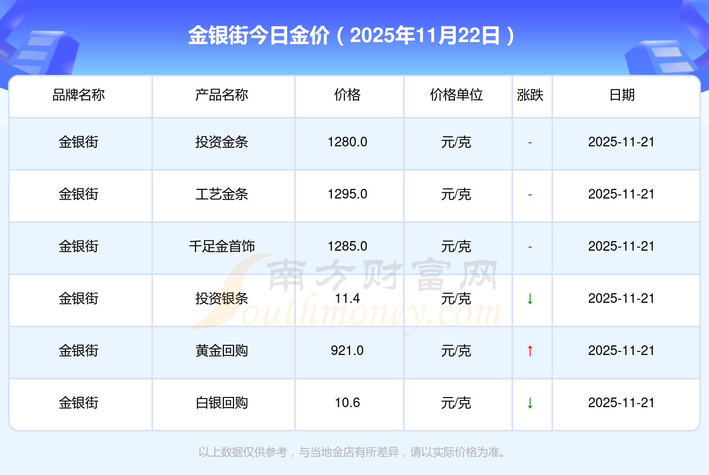 黄金价格1305.0元/克,铂金价格616.0元/克,饰品金价(内地)1305.0元/克,黄金饰品(香港)45110.0,铂金价格(香港)17570.0,金条价格(香港)40690.0,金条金价(内地)1143.0元/克,黄金价格1298.0元/克,铂金价格600.0元/克,足金价格1298.0元/克,黄金价格1266.0元/克。