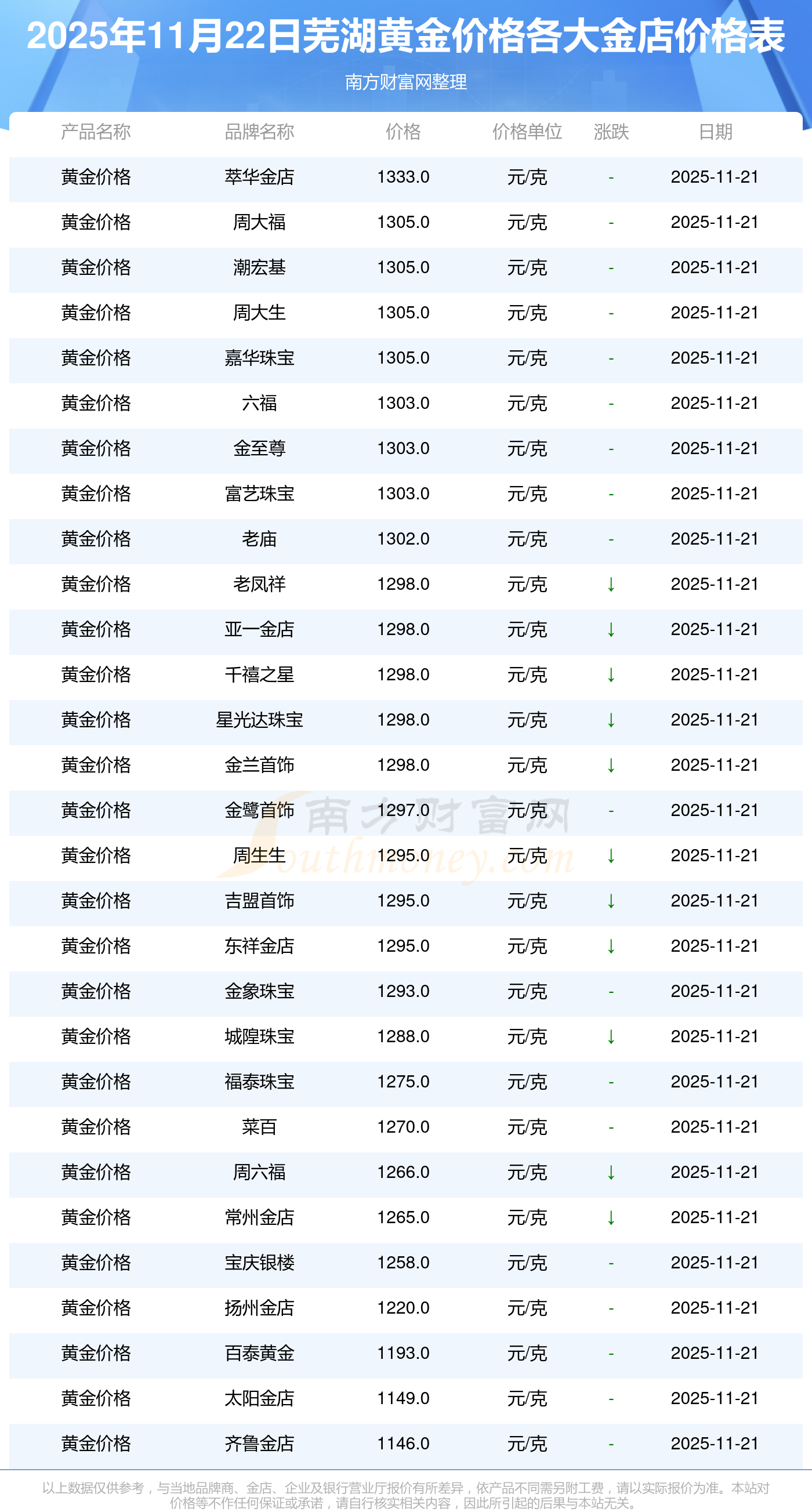 2025年11月22日芜湖周大福、周大福、周大福、周大福、周大福、周大福、周大福、老凤祥、老凤祥、老凤祥、周六福等各大金店品牌黄金价格最新价格行情来了,如下:周大福黄金价格1305.0元/克,周大福铂金价格616.0元/克,周大福饰品金价(内地)1305.0元/克,周大福黄金饰品(香港)45110.0,周大福铂金价格(香港)17570.0,周大福金条价格(香港)40690.0,周大福金条金价(内地)1143.0元/克,老凤祥黄金价格1298.0元/克,老凤祥铂金价格600.0元/克,老凤祥足金价格1298.0元/克,周六福黄金价格1266.0元/克。