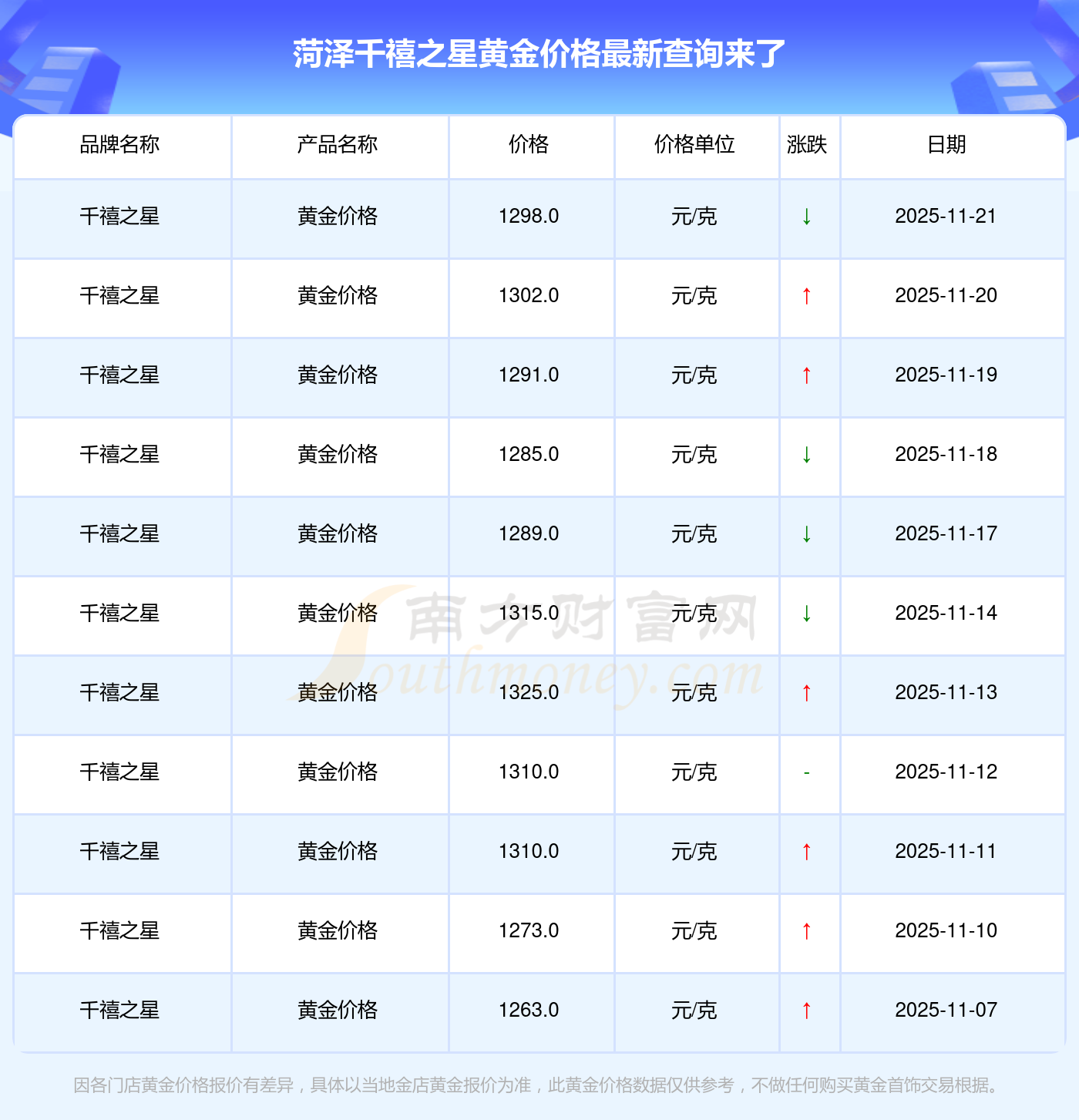 今日(2025年11月22日)菏泽千禧之星黄金价格最新价格为1298.0元/克。