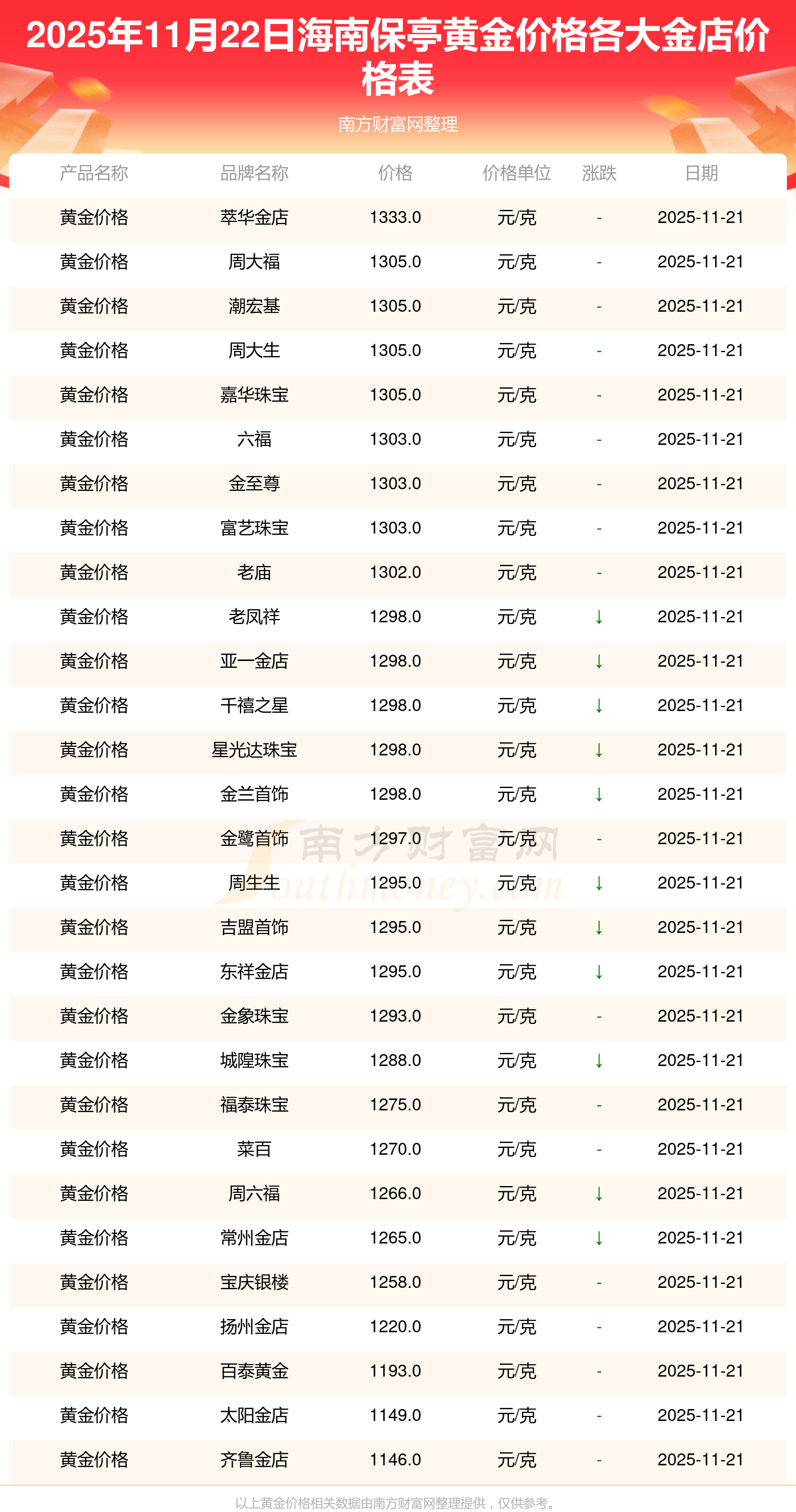 2025年11月22日海南保亭周大福、周大福、周大福、周大福、周大福、周大福、周大福、老凤祥、老凤祥、老凤祥、周六福等各大金店品牌黄金价格最新价格如下:周大福黄金价格1305.0元/克,周大福铂金价格616.0元/克,周大福饰品金价(内地)1305.0元/克,周大福黄金饰品(香港)45110.0,周大福铂金价格(香港)17570.0,周大福金条价格(香港)40690.0,周大福金条金价(内地)1143.0元/克,老凤祥黄金价格1298.0元/克,老凤祥铂金价格600.0元/克,老凤祥足金价格1298.0元/克,周六福黄金价格1266.0元/克。