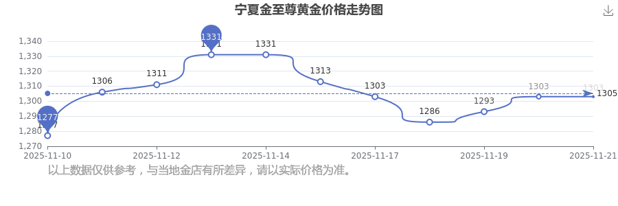 今日一克黄金的价钱是多少?今日宁夏金至尊黄金价格查询,今日(2025年11月22日),1303.0元/克是宁夏金至尊黄金价格的价格标准。