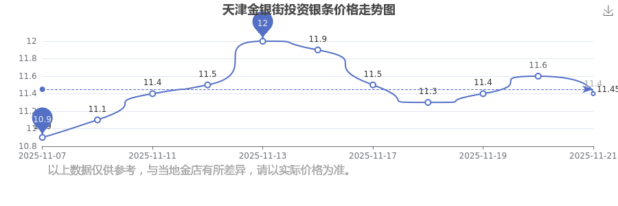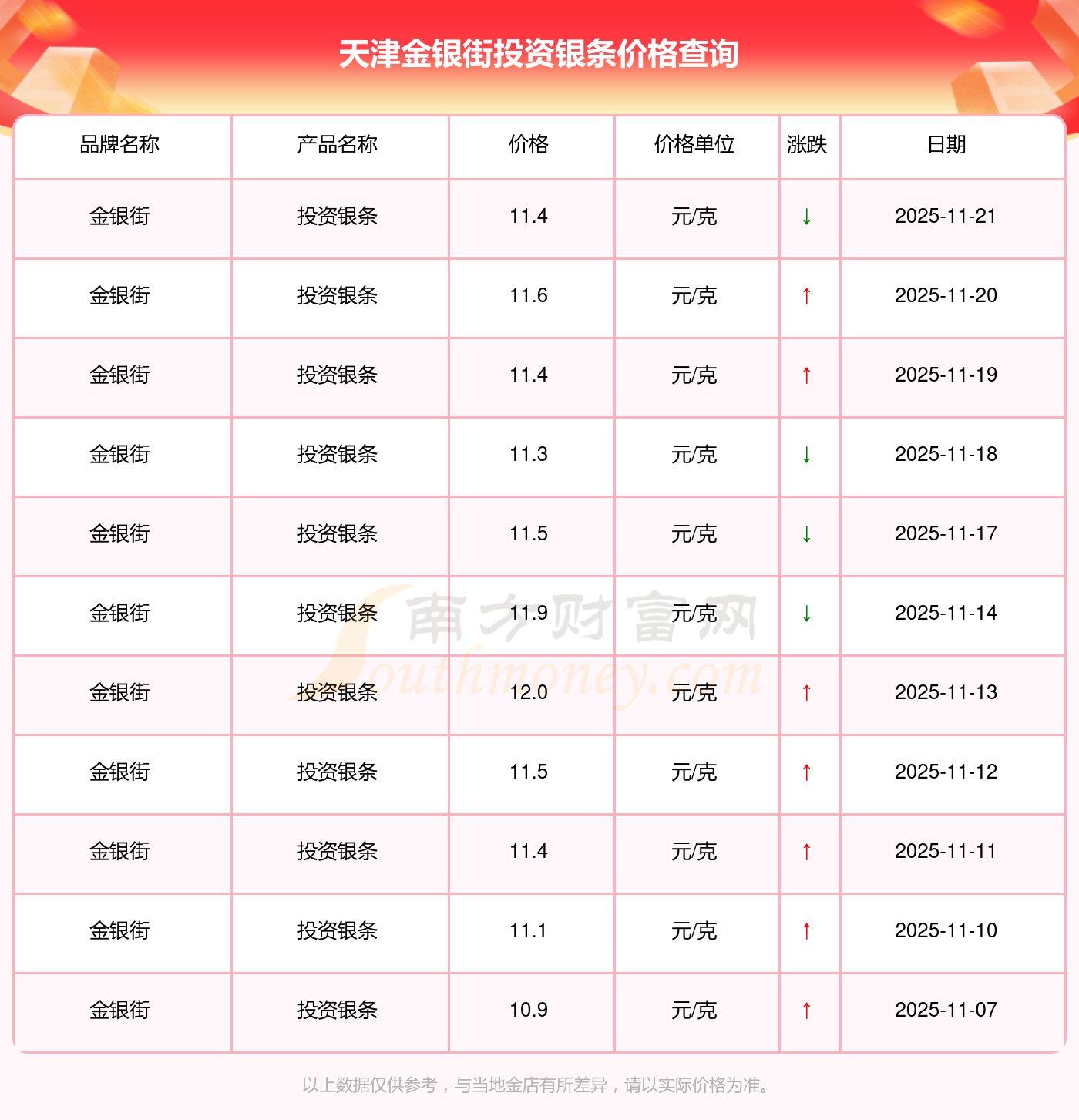 2025年11月22日天津金银街投资银条价格为11.4元/克。