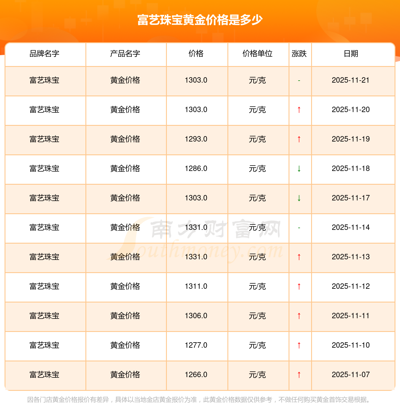 今日富艺珠宝黄金价格最新查询:1303.0元/克。