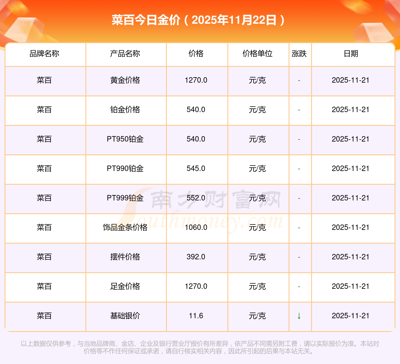 以上数据仅供参考,与当地金店有所差异,请以实际价格为准。