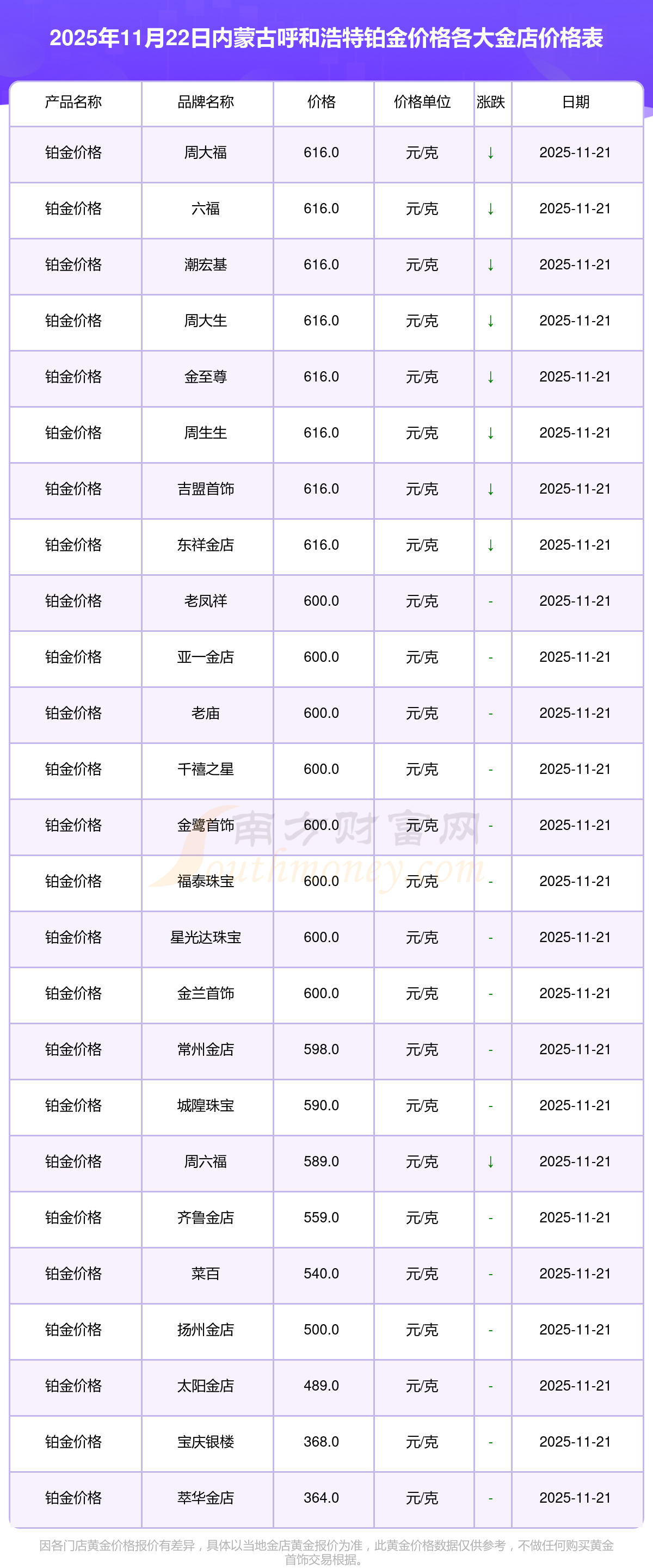 今天是2025年11月22日,内蒙古呼和浩特周大福、周大福、周大福、周大福、周大福、周大福、周大福、老凤祥、老凤祥、老凤祥、周六福等各大金店品牌铂金价格最新价格如下:周大福1305.0元/克、周大福616.0元/克、周大福1305.0元/克、周大福45110.0、周大福17570.0、周大福40690.0、周大福1143.0元/克、老凤祥1298.0元/克、老凤祥600.0元/克、老凤祥1298.0元/克、周六福1266.0元/克。