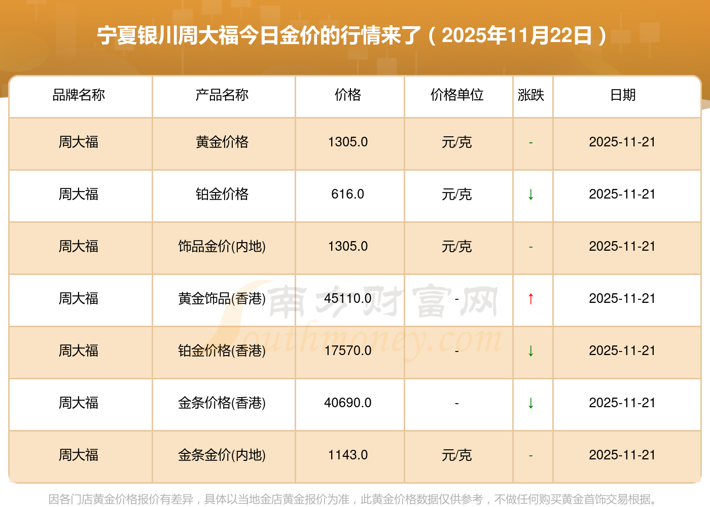 黄金价格1305.0元/克,铂金价格616.0元/克,饰品金价(内地)1305.0元/克,黄金饰品(香港)45110.0,铂金价格(香港)17570.0,金条价格(香港)40690.0,金条金价(内地)1143.0元/克,黄金价格1298.0元/克,铂金价格600.0元/克,足金价格1298.0元/克,黄金价格1266.0元/克。