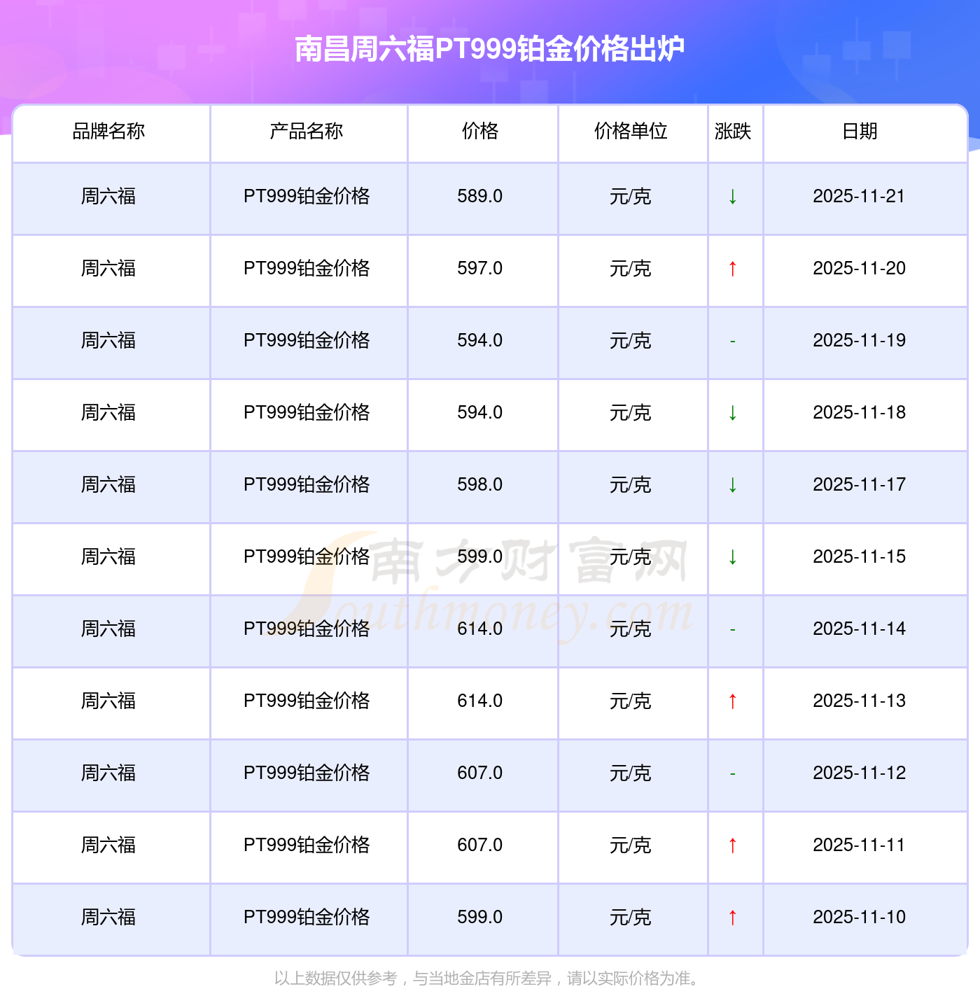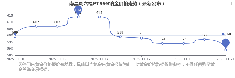 589.0元/克的PT999铂金价格,是南昌周六福在 2025年11月22日给出的。