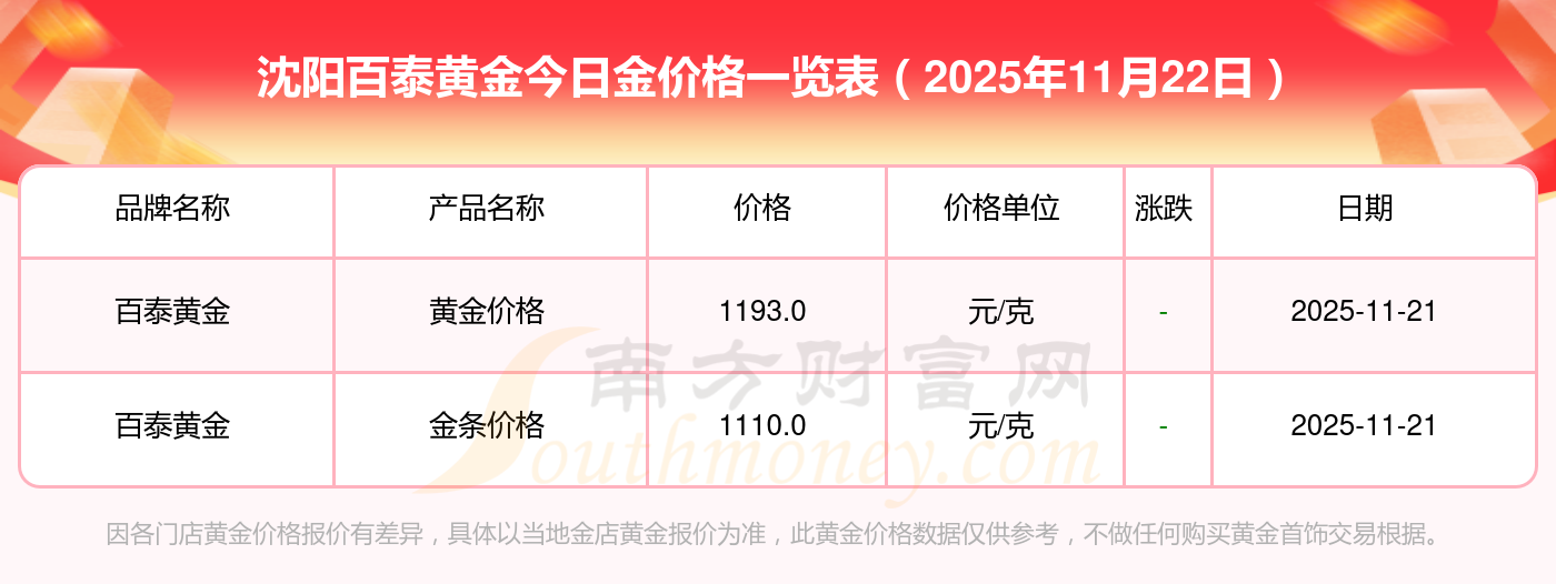 2025年11月22日沈阳百泰黄金最新价格:黄金价格1305.0元/克,铂金价格616.0元/克,饰品金价(内地)1305.0元/克,黄金饰品(香港)45110.0,铂金价格(香港)17570.0,金条价格(香港)40690.0,金条金价(内地)1143.0元/克,黄金价格1298.0元/克,铂金价格600.0元/克,足金价格1298.0元/克,黄金价格1266.0元/克。
