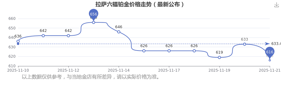 2025年11月22日这一天,拉萨六福的铂金价格以 616.0元/克的价格售卖。