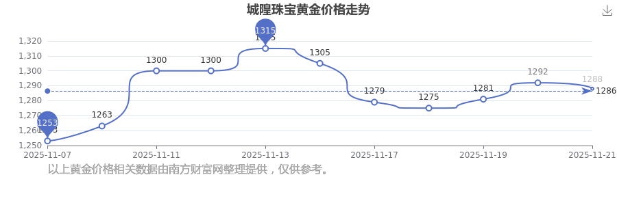 2025年11月22日城隍珠宝黄金价格:1288.0元/克。