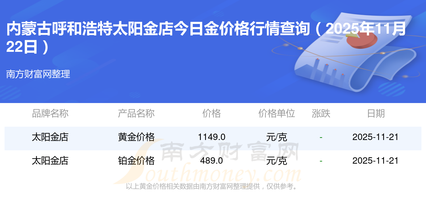 2025年11月22日内蒙古呼和浩特太阳金店现在黄金一克要多少钱:黄金价格1305.0元/克,铂金价格616.0元/克,饰品金价(内地)1305.0元/克,黄金饰品(香港)45110.0,铂金价格(香港)17570.0,金条价格(香港)40690.0,金条金价(内地)1143.0元/克,黄金价格1298.0元/克,铂金价格600.0元/克,足金价格1298.0元/克,黄金价格1266.0元/克。