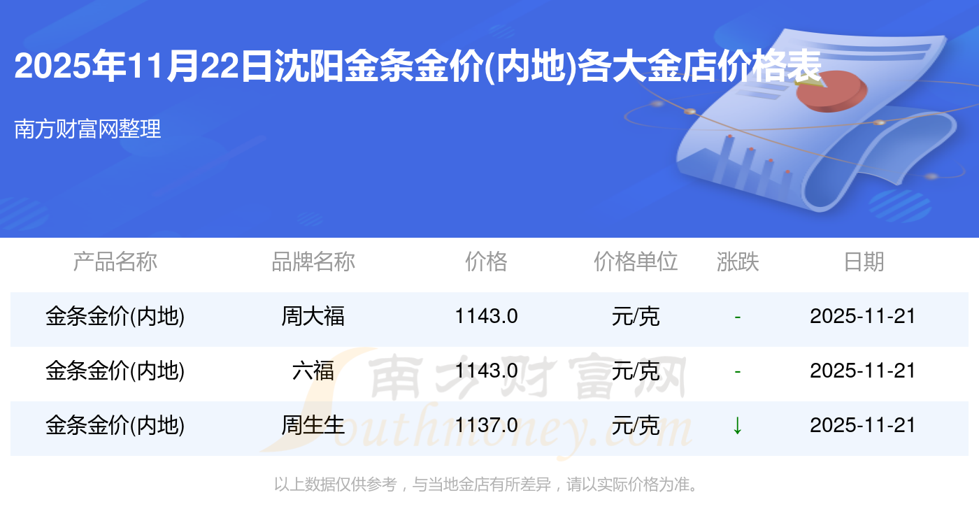 今天是2025年11月22日,沈阳周大福、周大福、周大福、周大福、周大福、周大福、周大福、老凤祥、老凤祥、老凤祥、周六福等各大金店品牌金条金价(内地)最新价格如下:周大福1305.0元/克、周大福616.0元/克、周大福1305.0元/克、周大福45110.0、周大福17570.0、周大福40690.0、周大福1143.0元/克、老凤祥1298.0元/克、老凤祥600.0元/克、老凤祥1298.0元/克、周六福1266.0元/克。