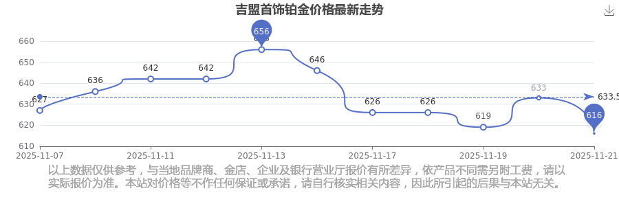 2025年11月22日吉盟首饰铂金价格查询:616.0元/克。